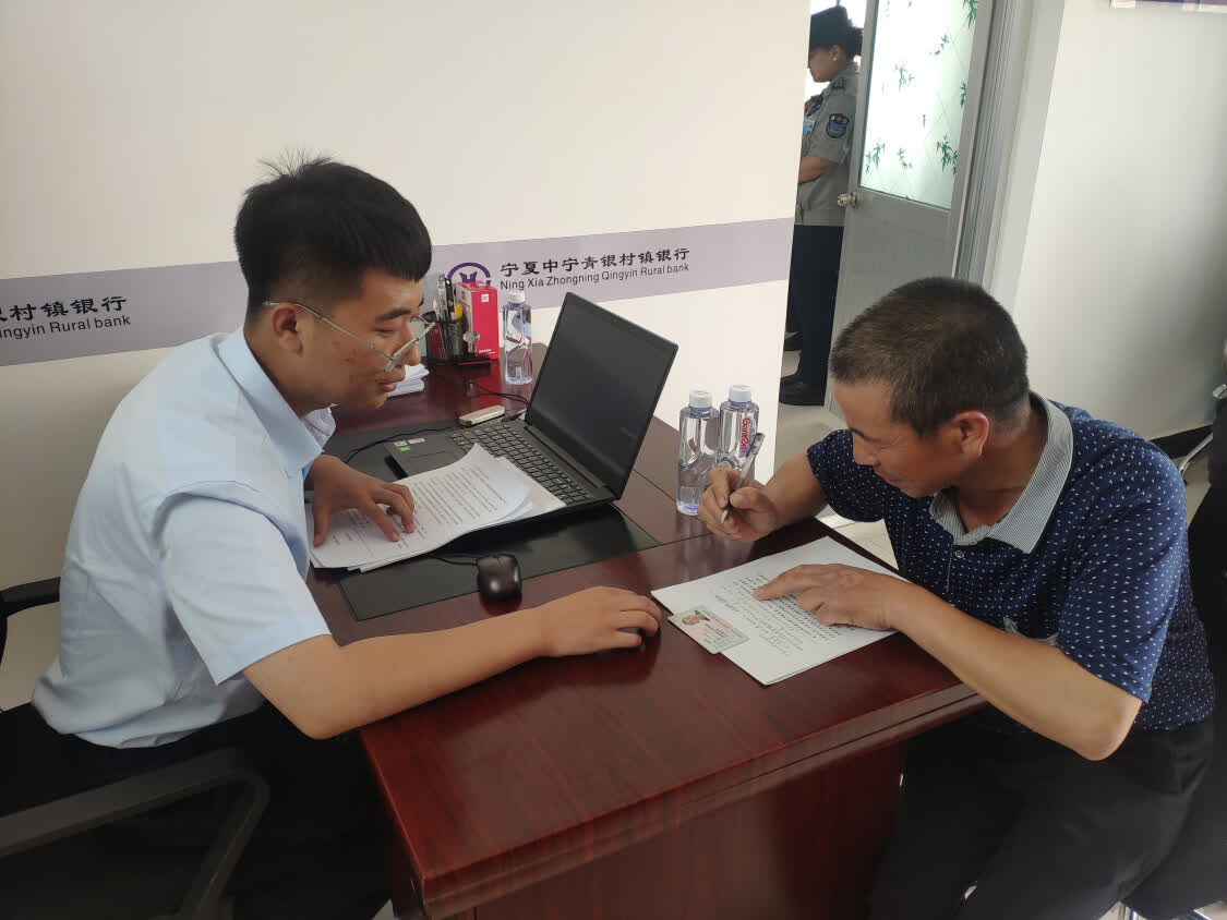 6月16日(ri),在(zai)寧夏中(zhong)衛市中(zhong)寧縣青銀村鎮銀行恩和(he)鎮雙井子雙基(ji)聯動信貸(dai)工作室,雙井子村村民(min)馬(ma)如(ru)學前來辦理貸(dai)款。