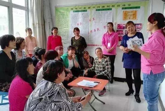 推廣員趙娜(右一)和大組長張秀蓮(右二)開展活動室分享